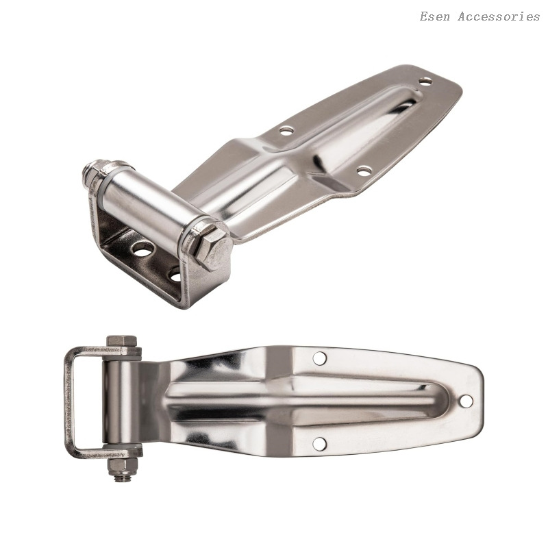 Heavy duty polished stainless steel door hinges, ideal for side/rear doors of container trucks, refrigerated trucks and cargo vans. High corrosion resistance, smooth finish, strong load-bearing, long service life for logistics and cold chain transportation.